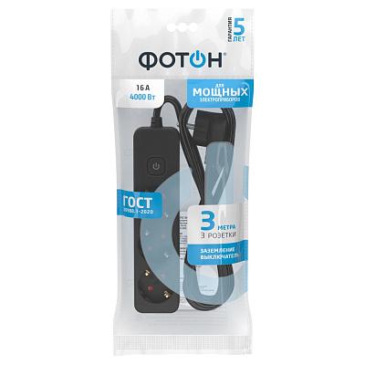 Удлинитель сетевой "ФОТОН" 16-33ЕS, 3м, 3 розетки, 16А, с выкл., с заземл., Черный 1/20/20