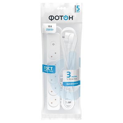 Удлинитель сетевой "ФОТОН" 10-35S, 3м, 5 розеток, 10А, с выкл., Белый 1/20/20