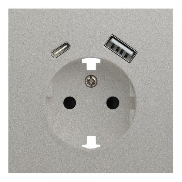 Розетка с заземлением, шторками и USB тип A+C (серебряный матовый) W1171765